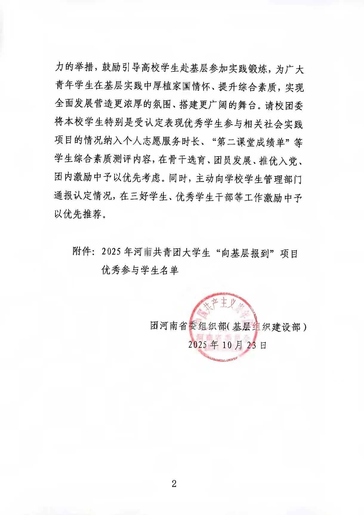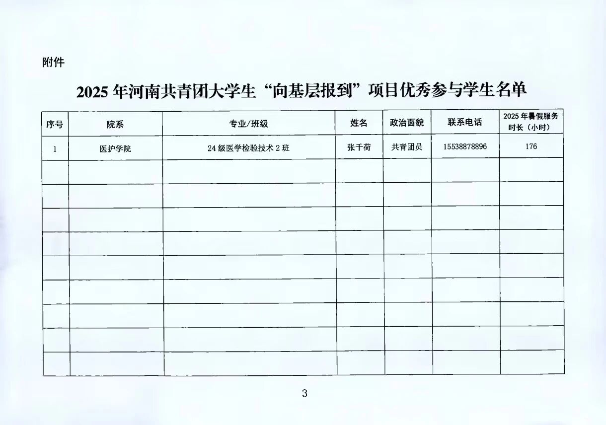 近日,共青团河南省委员会印发《关于认定2025年度河南共青团大学生“向基层报到”优秀参与学生的函》,文件肯定了我校大学生在“向基层报到”等社会实践项目中的突出表现和卓越贡献,医护学院张千荷同学被团省委认定为优秀参与学生。